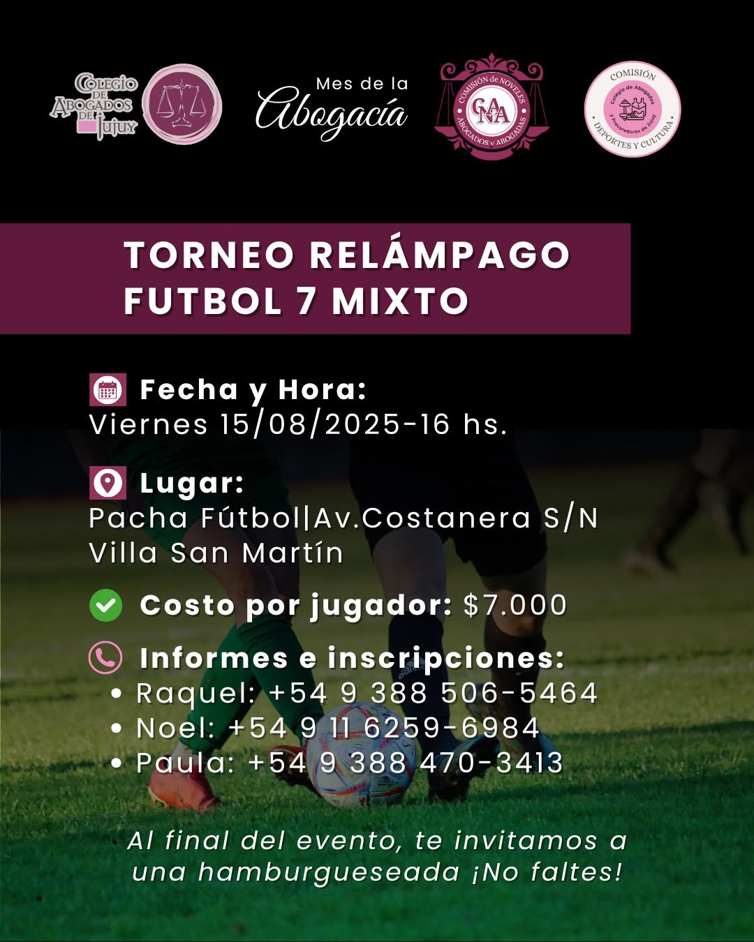 Torneo Relámpago Futbol 7 Mixto FÚTBOL y HAMBURGUESEADA La COMISIÓN DE DEPORTE Y CULTURA, en conjunto con la COMISIÓN DE NÓVELES ABOGADOS Y ABOGADAS, te invitan a participar de una Leer Más » 13/08/2025