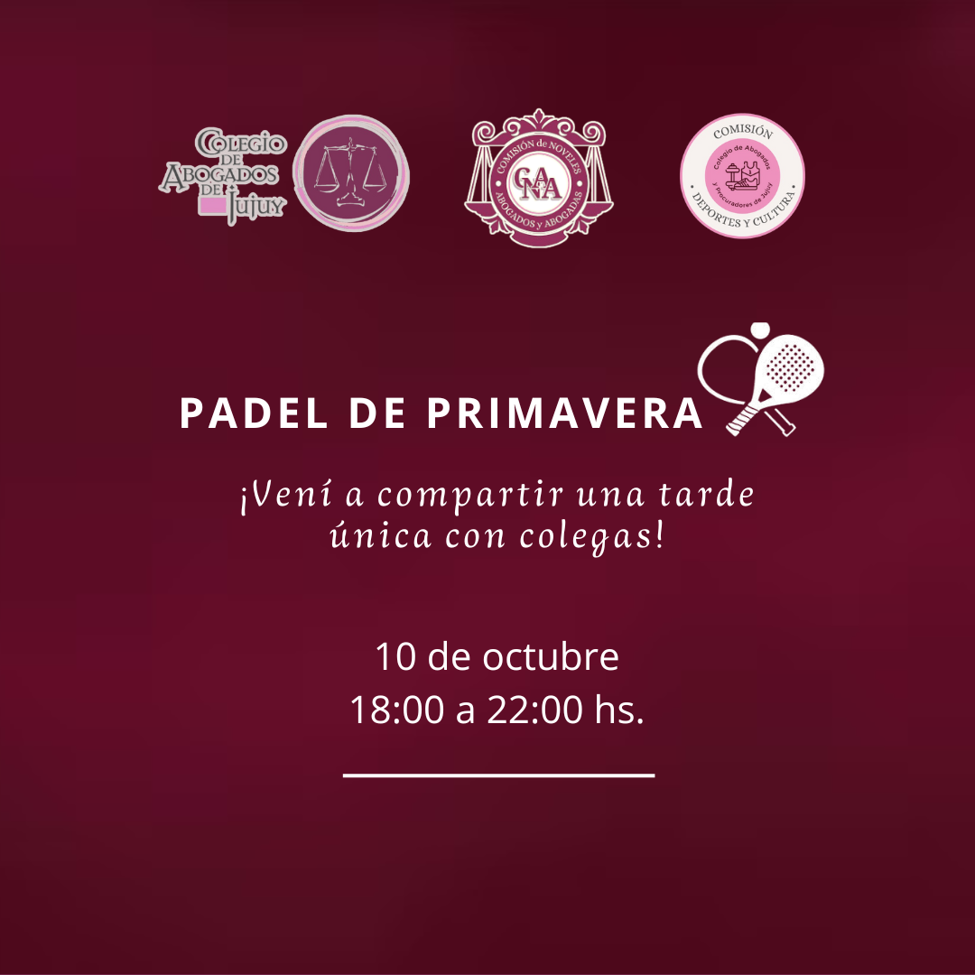 PADEL DE PRIMAVERA PADEL DE PRIMAVERA FECHA Y HORA: 10 de Octubre – 18:00 a 22:00 hs. LUGAR: Club Baldo’s – La Posta N°77 S.S. de Jujuy COSTO Leer Más » 02/10/2025