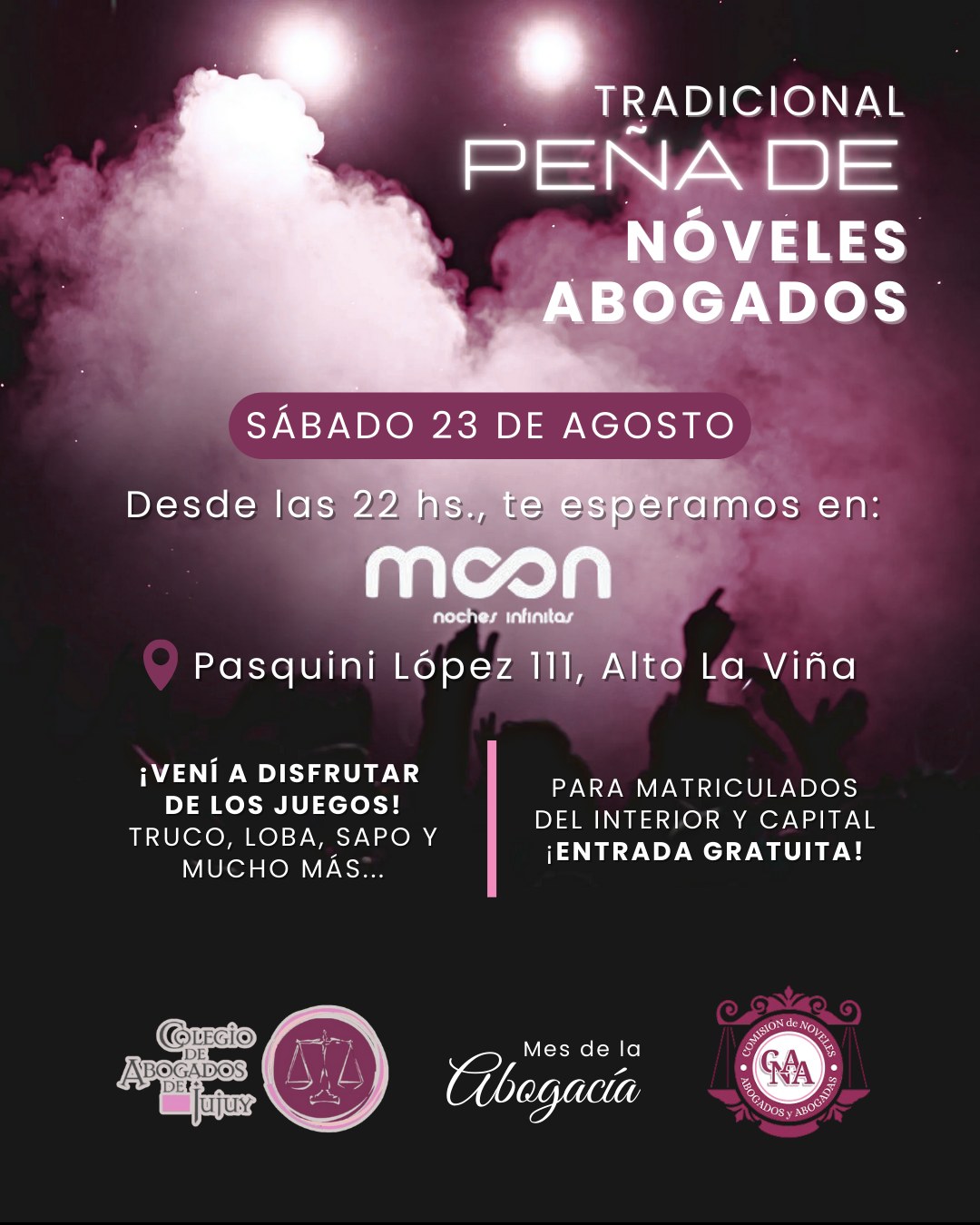 Te invitamos a la Tradicional Peña de Noveles Abogados Sábado 23 de agostoMoon – Pasquini López 111, Alto La Viña ¡Vení a disfrutar de una