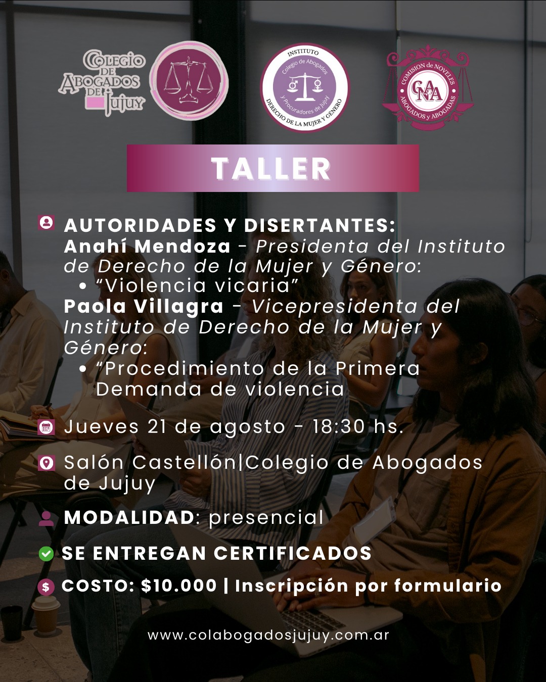 Taller – Instituto de Derecho de la Mujer y Género Autoridades y disertantes: Dra. Anahí Mendoza – Presidenta: “Violencia vicaria” Dra. Paola Villagra – Vicepresidenta: