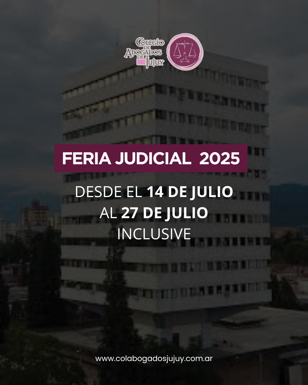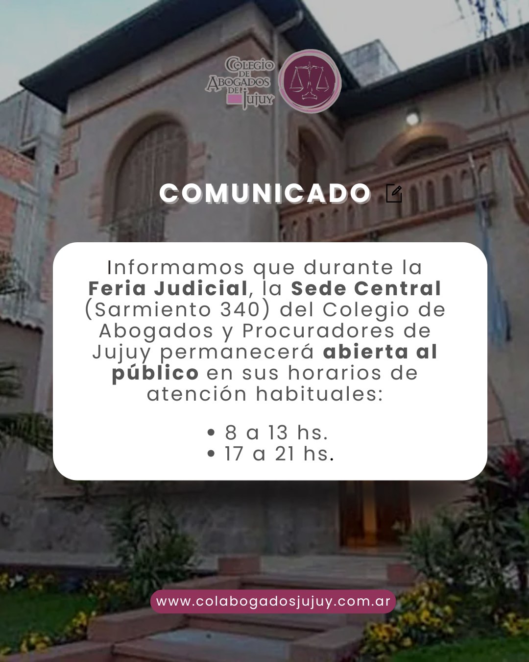 Informamos que, durante la feria judicial, el Colegio de Abogados y Procuradores de Jujuy permanecerá abierto en sus horarios habituales. De 8 a 13 hs