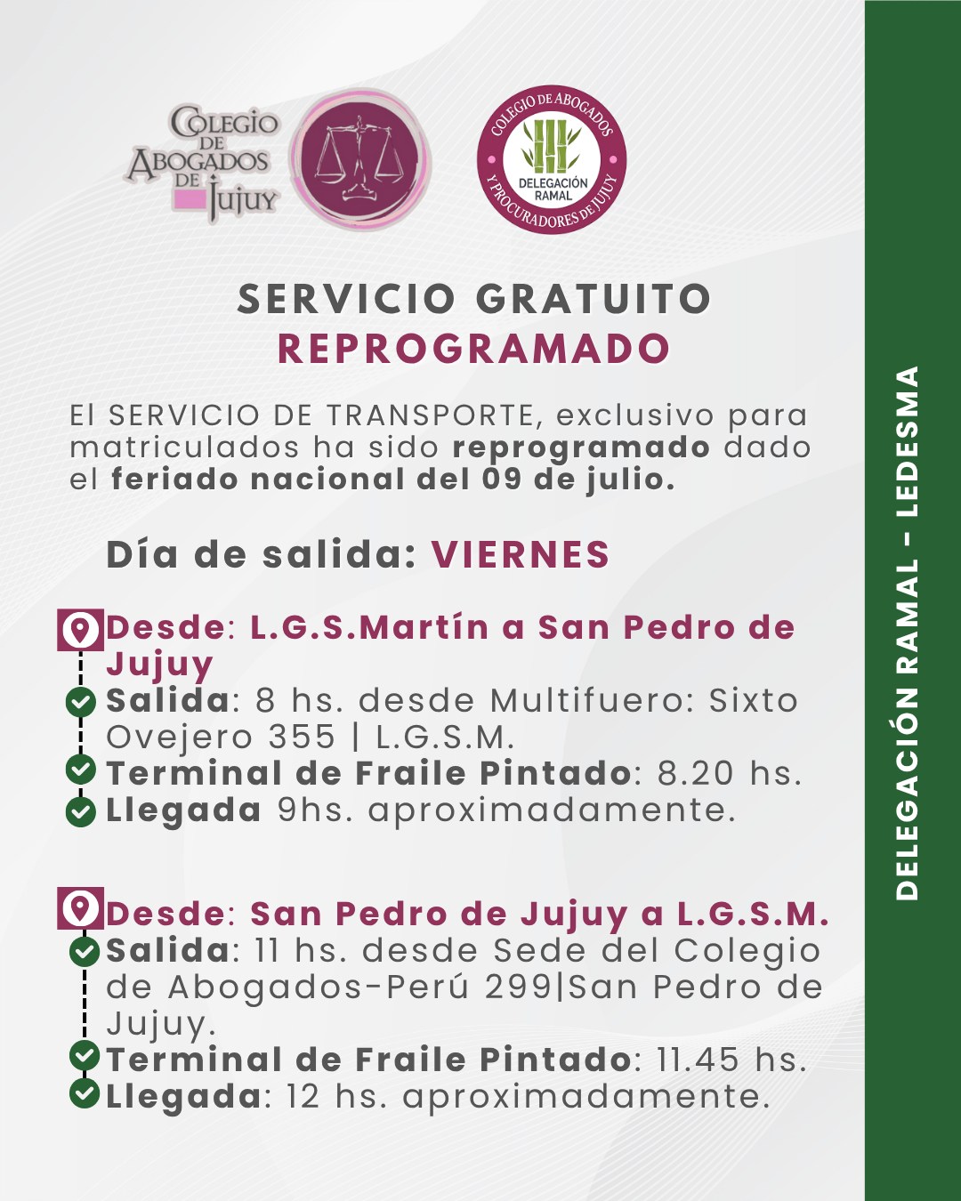 Desde la Delegación Ramal – Ledesma y el CAJ te comentamos que el SERVICIO DE TRANSPORTE , exclusivo para matriculados ha sido reprogramado dado el feriado nacional del