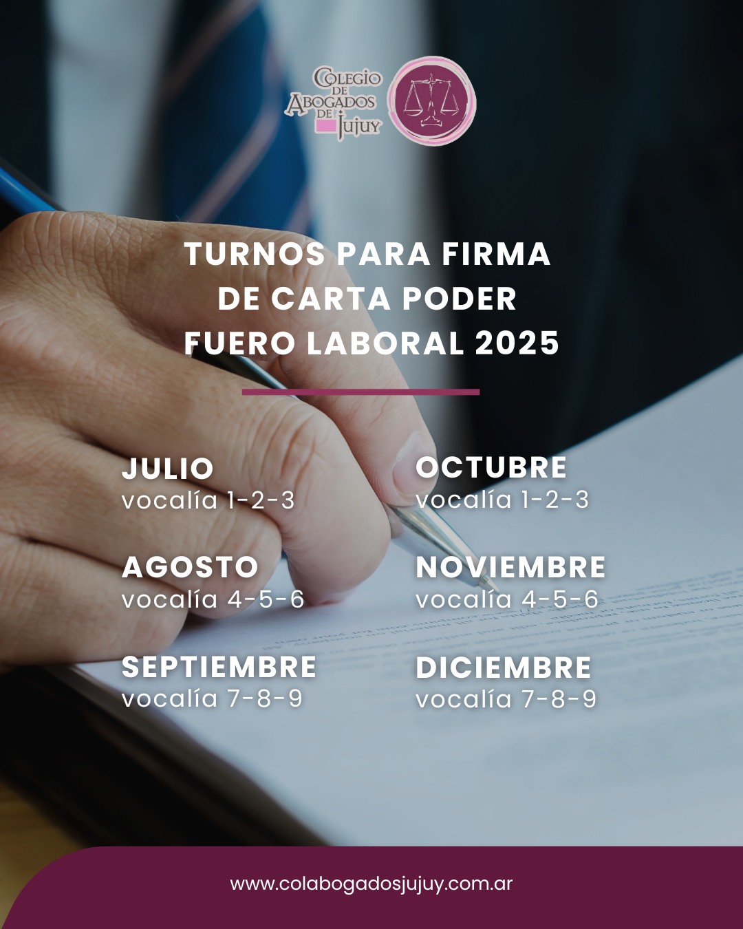 Informamos a los matriculados que ya se encuentran disponibles los turnos para la firma de Carta Poder correspondiente al Fuero Laboral 2025. Colegio de Abogados