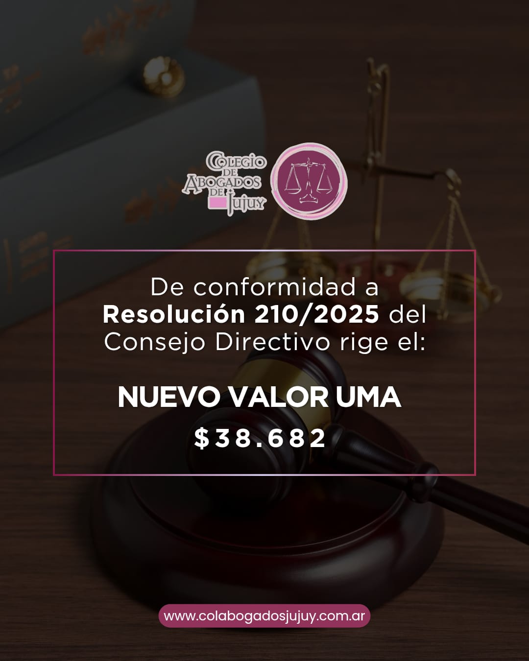 Actualización del valor UMA De conformidad con la Resolución N.º 210/2025, el Consejo Directivo del Colegio de Abogados y Procuradores de Jujuy informa que se