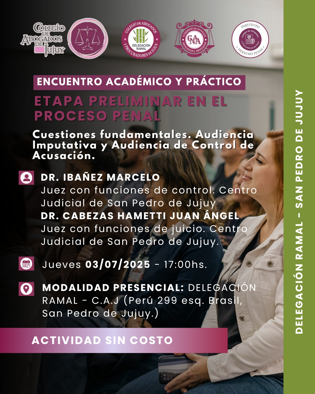 ENCUENTRO ACADÉMICO Y PRÁCTICO LA COMISIÓN DE NÓVELES ABOGADOS Y ABOGADAS, la DELEGACIÓN RAMAL, y el INSTITUTO DE DERECHO PENAL, te invitan a participar de