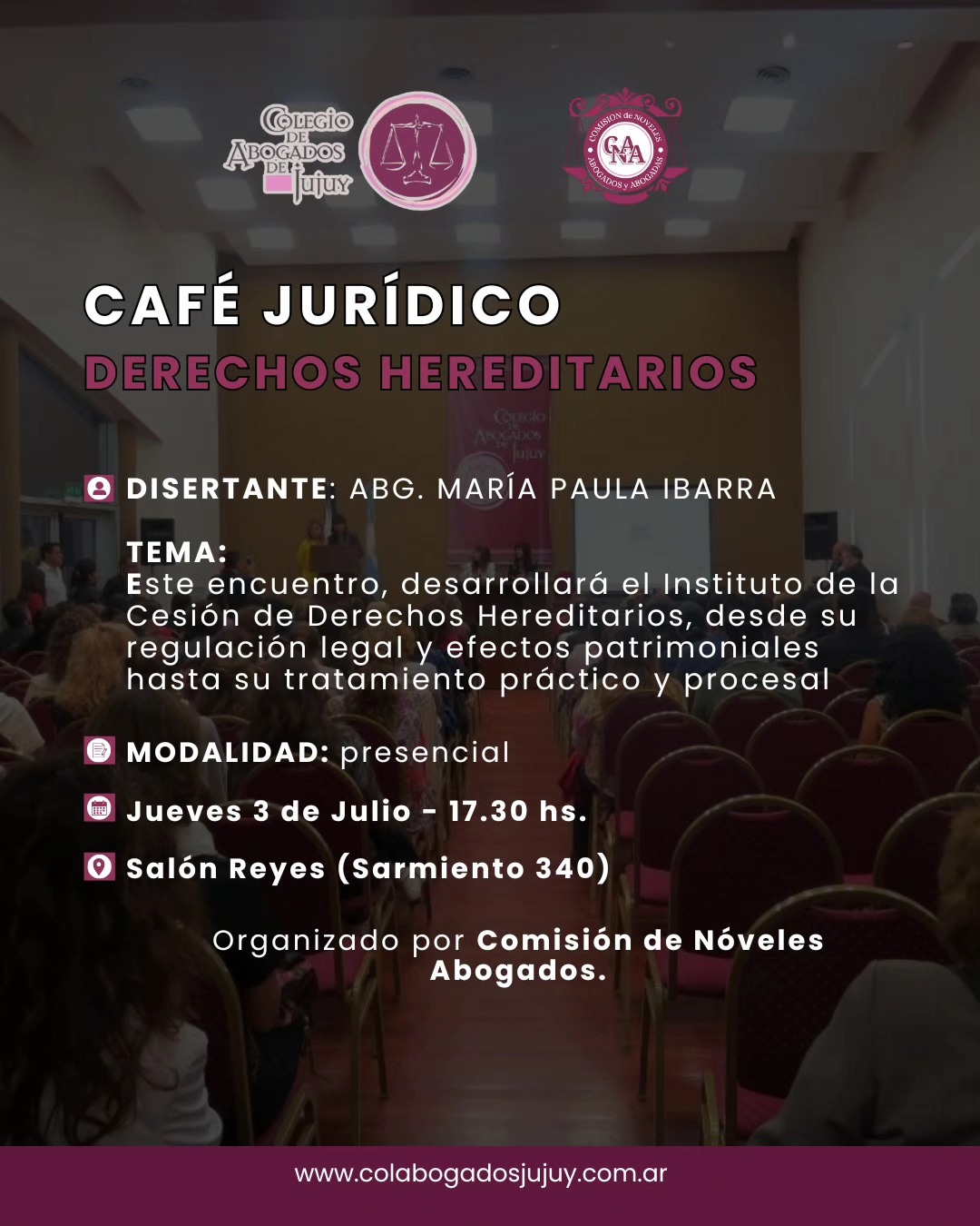 Cafe jurídico: Derechos hereditarios Disertante: La Dra. María Paula Ibarra Tema: En este encuentro, desarrollará el instituto de la cesión de derechos hereditarios, desde su