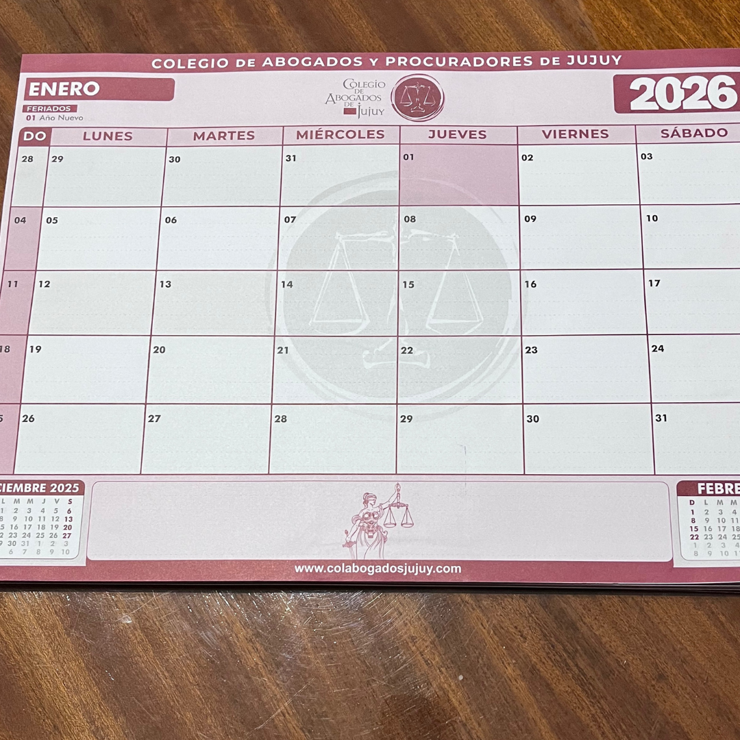 El Colegio de Abogados y Procuradores de Jujuy informa que los calendarios 2026 ya se encuentran disponibles para toda la matrícula. Podrán ser retirados de
