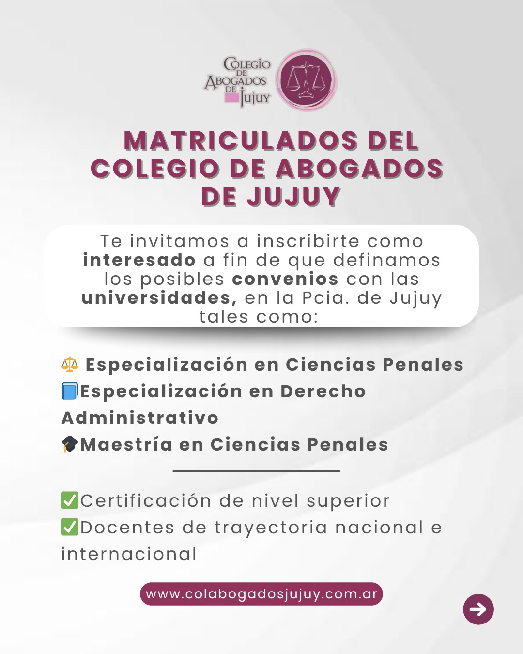 Por eso, te invitamos a inscribirte como interesado a fin de que definamos los posibles convenios con las universidades, pensadas especialmente para el ejercicio profesional en la Provincia de Jujuy tales como:
