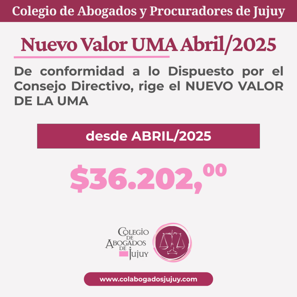 Estimados colegas, les compartimos el NUEVO VALOR del UMA, válido desde Abril/2025, según Resolución N° 080/2025 del Consejo Directivo del CAJ.